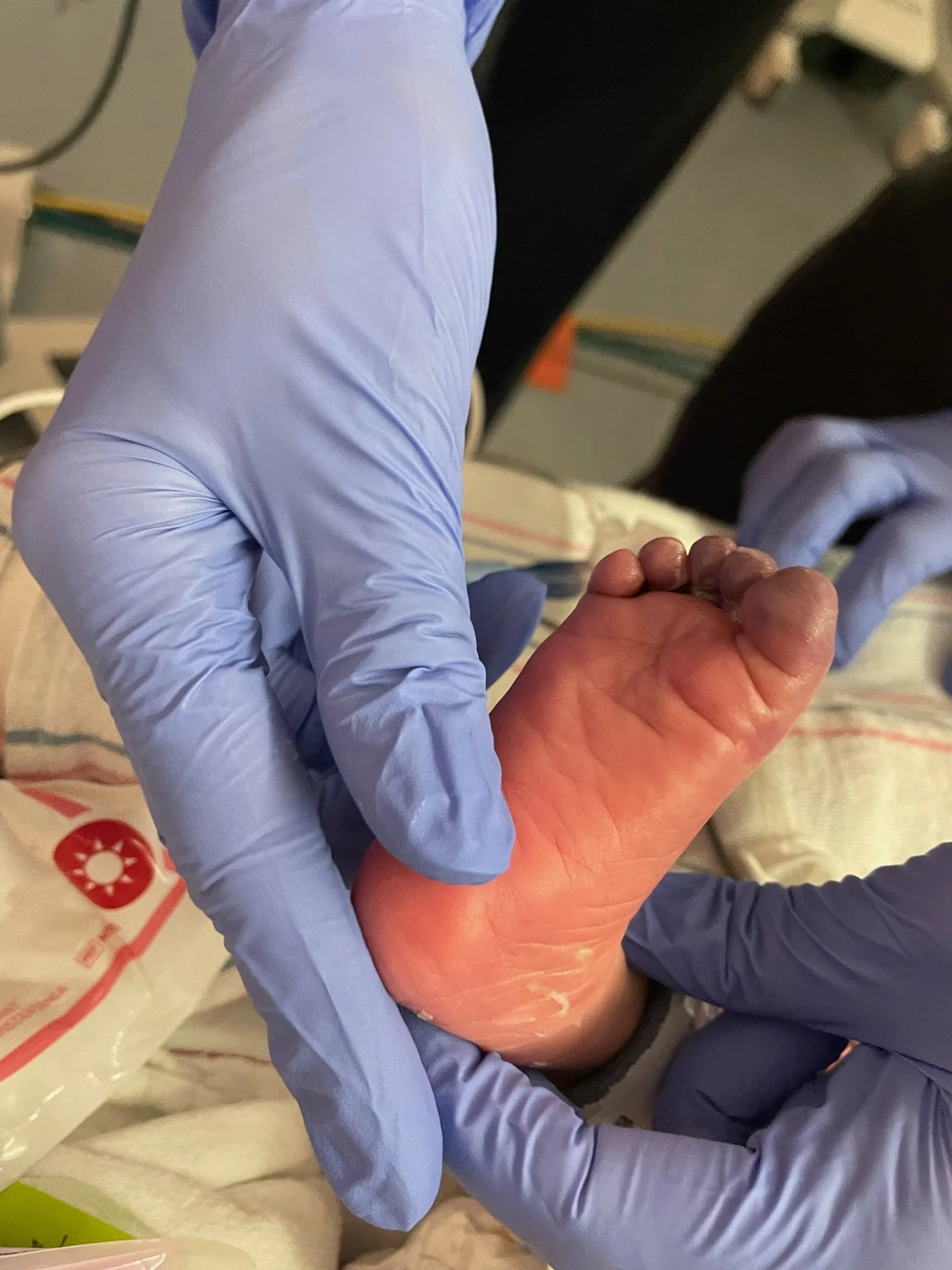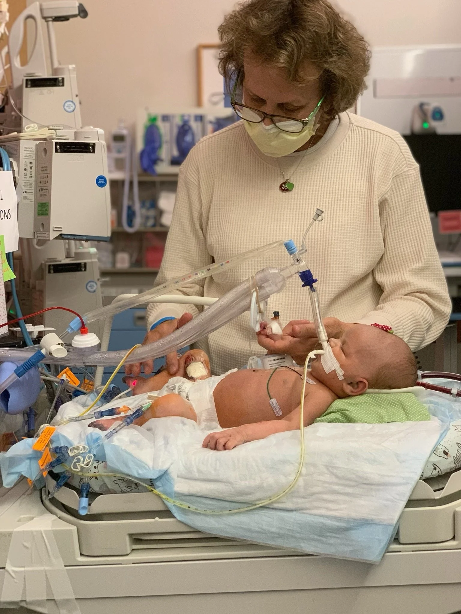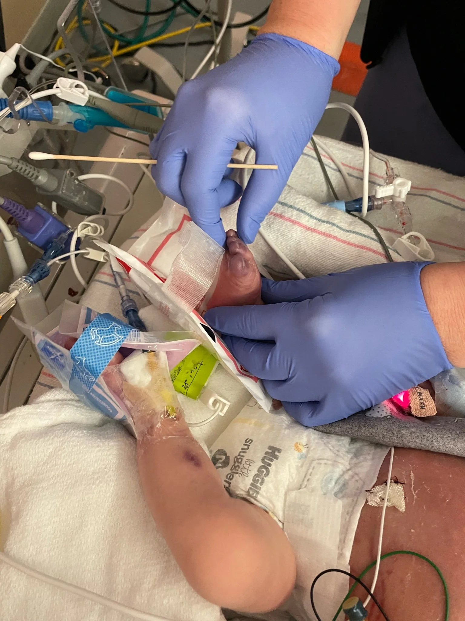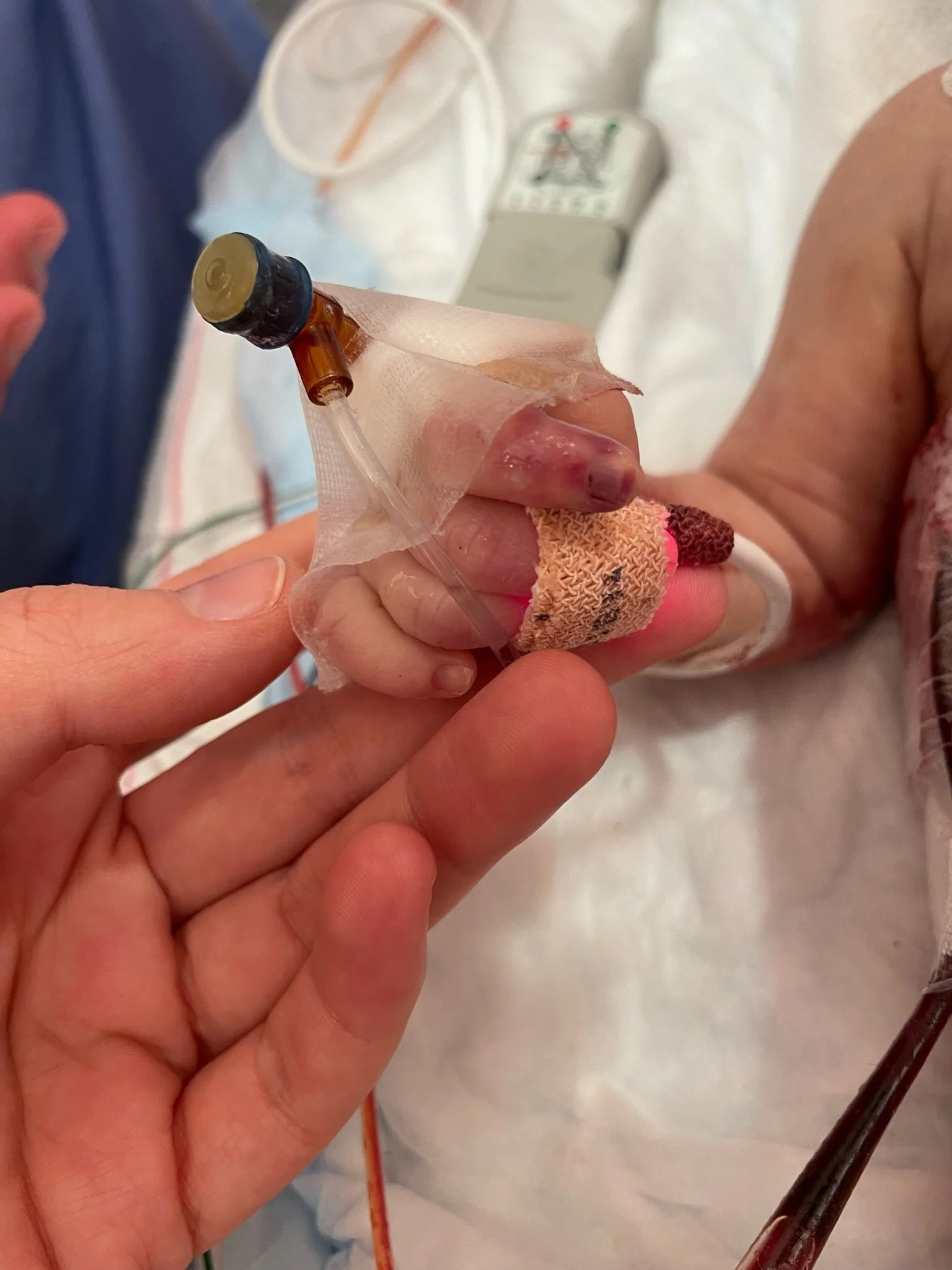 Her toes were almost completely black and she had several fingers going in that direction. Everyone said there was nothing they could do but it was impossible to sit by and be like, “Okay, so she just won’t have fingers and toes.” Logically you can understand the importance of lung function over your hands and feet but having to repeatedly hear that it was the least of her issues was infuriating. Why weren’t more people coming to figure this out? Why weren’t people freaking out? How are they so resigned that there’s nothing they can do? Why is there a heat pack shortage? Kevin was ready to start buying them off Amazon before we were told they couldn’t accept outside products for the liability. I hadn’t really even understood why Plastics was the team who had recommended Nitro Paste and heat from the start until this point where we learned that they would be the team amputating her finger and toes which were dying before our eyes. They were pink and healthy and wiggling just days ago. When one of our surgeon’s matter of factly told me she would lose them, I fell into hysterics and couldn’t stop shaking my head. This cannot be happening to my darling baby. She needs her fingers. She needs her toes. How is this such a low priority?