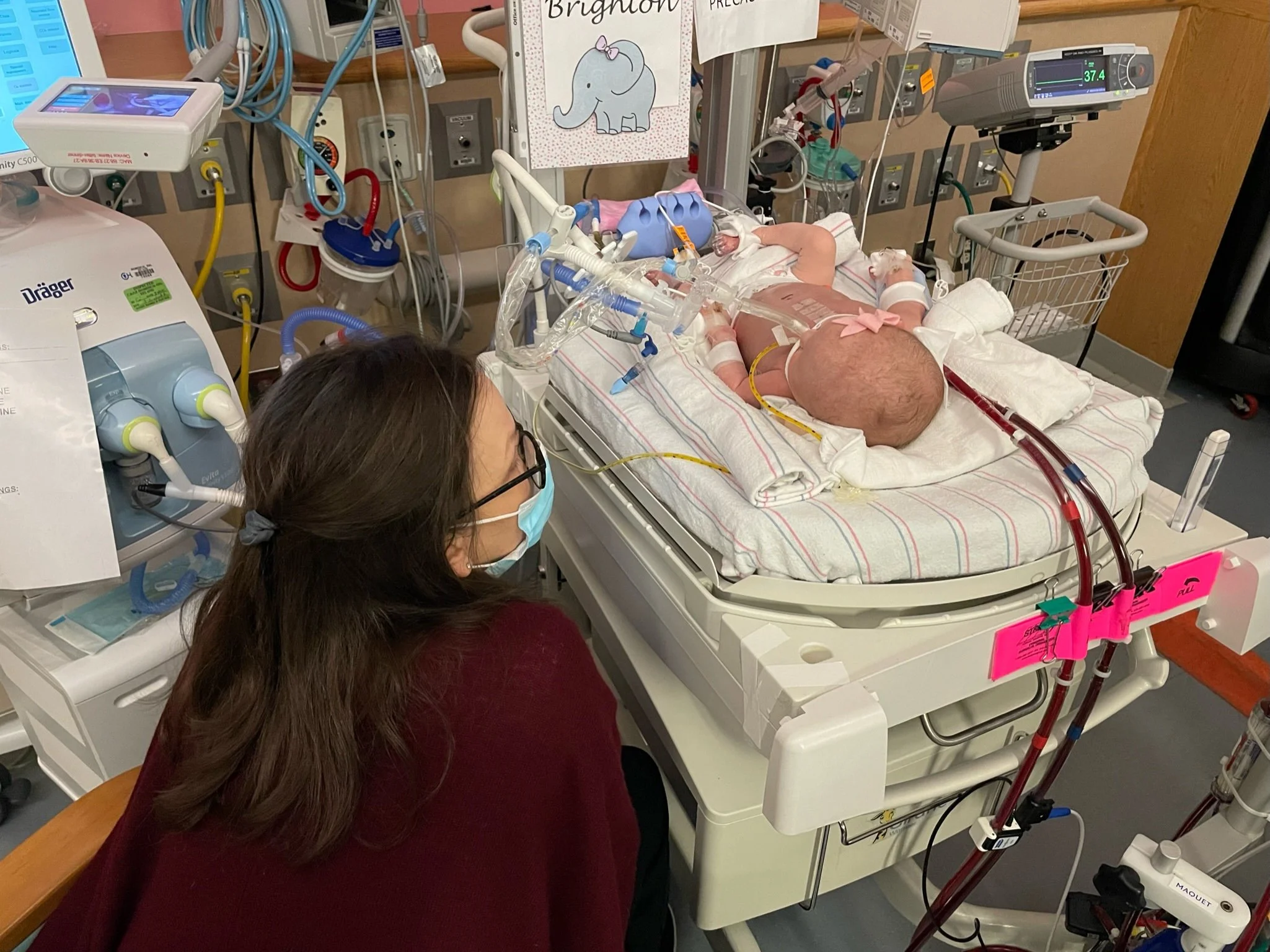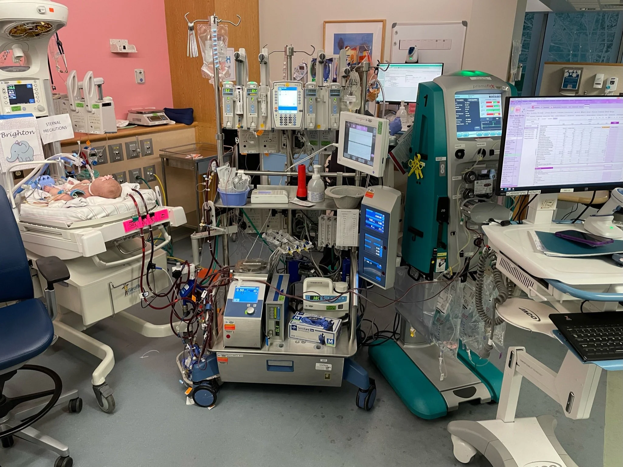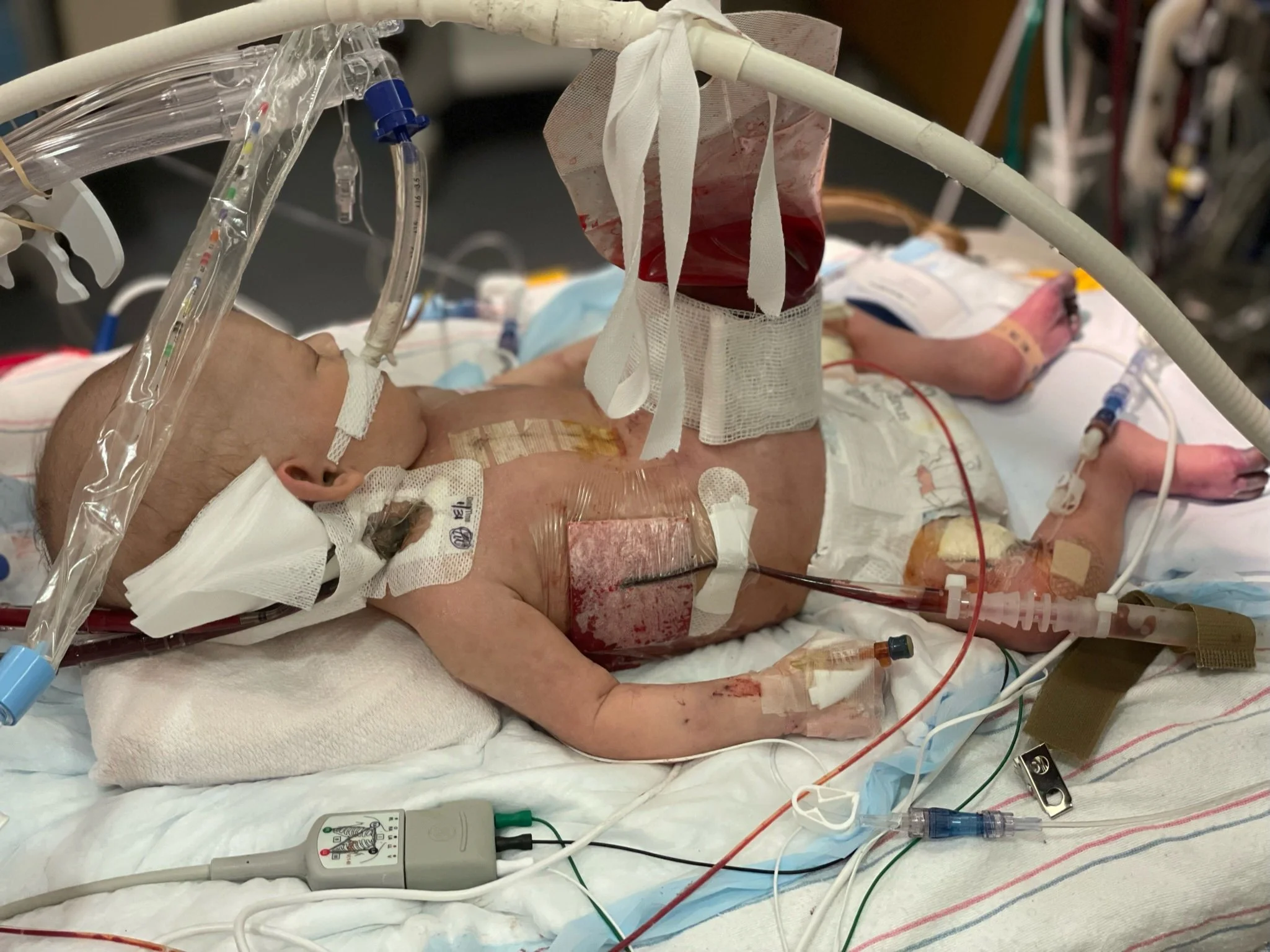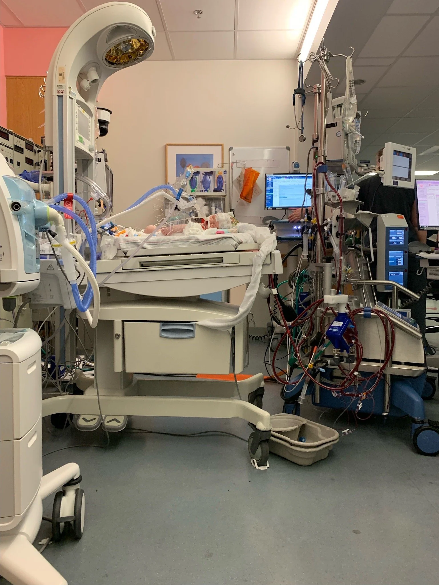 After about 6 hours, we were notified that the baby needed ECMO. This was not going to be a typical CDH course - ECMO is effectively a version of life support and while not unusual for CDH patients, it’s for more severe cases. We knew this could happen and were relieved that the procedure to get her onto ECMO, which is significant, was successful. Unfortunately, not even 2 hours later, the surgeon was back in our room telling us the baby had unusual fluid buildup around her heart and would require exploratory surgery immediately and that she was in critical condition. They suspected she may have a perforated heart or an undiagnosed defect and her life was in danger.