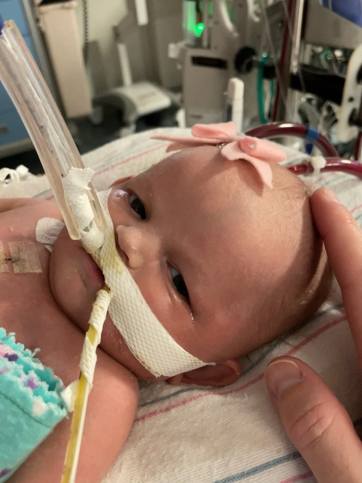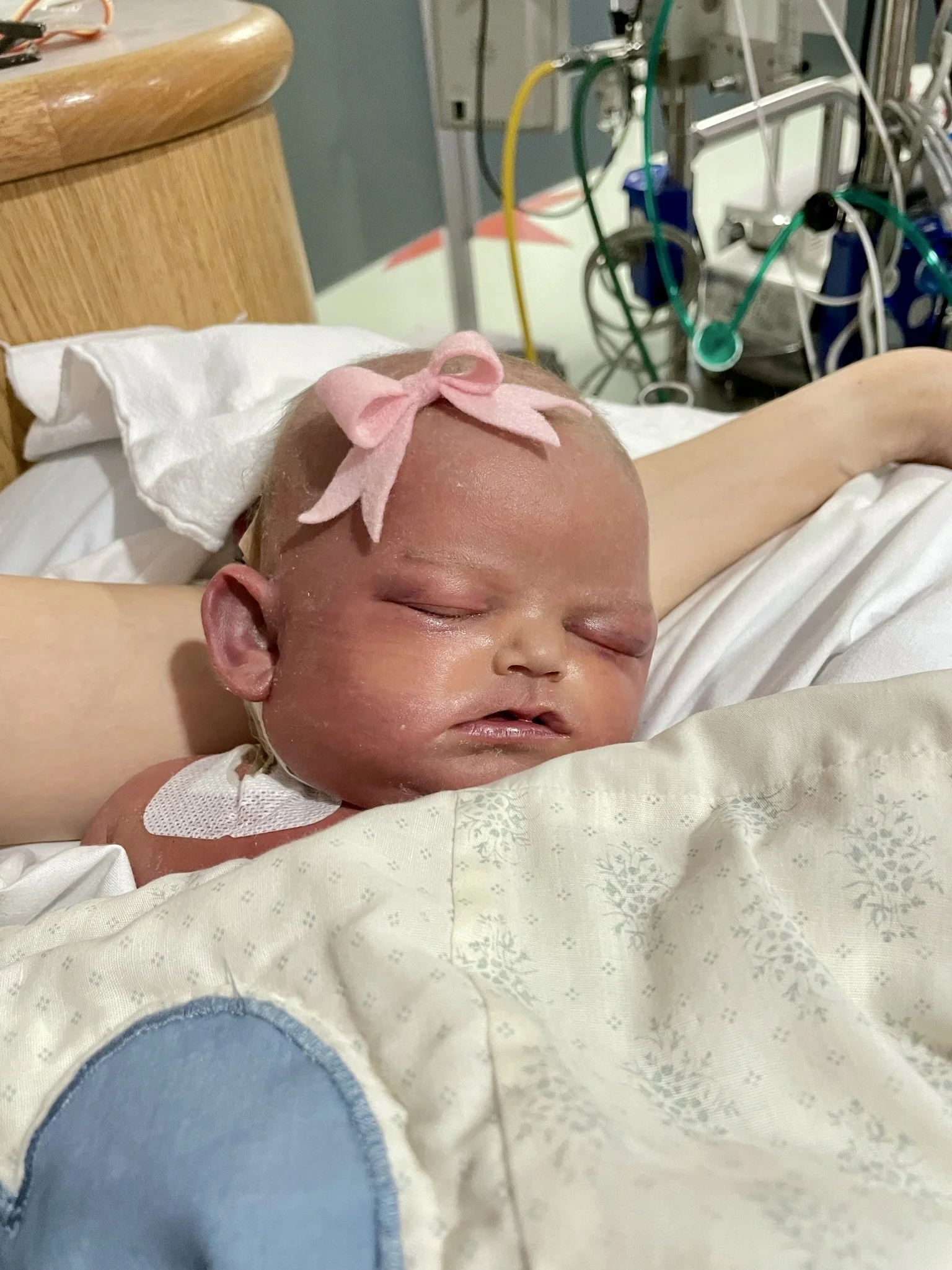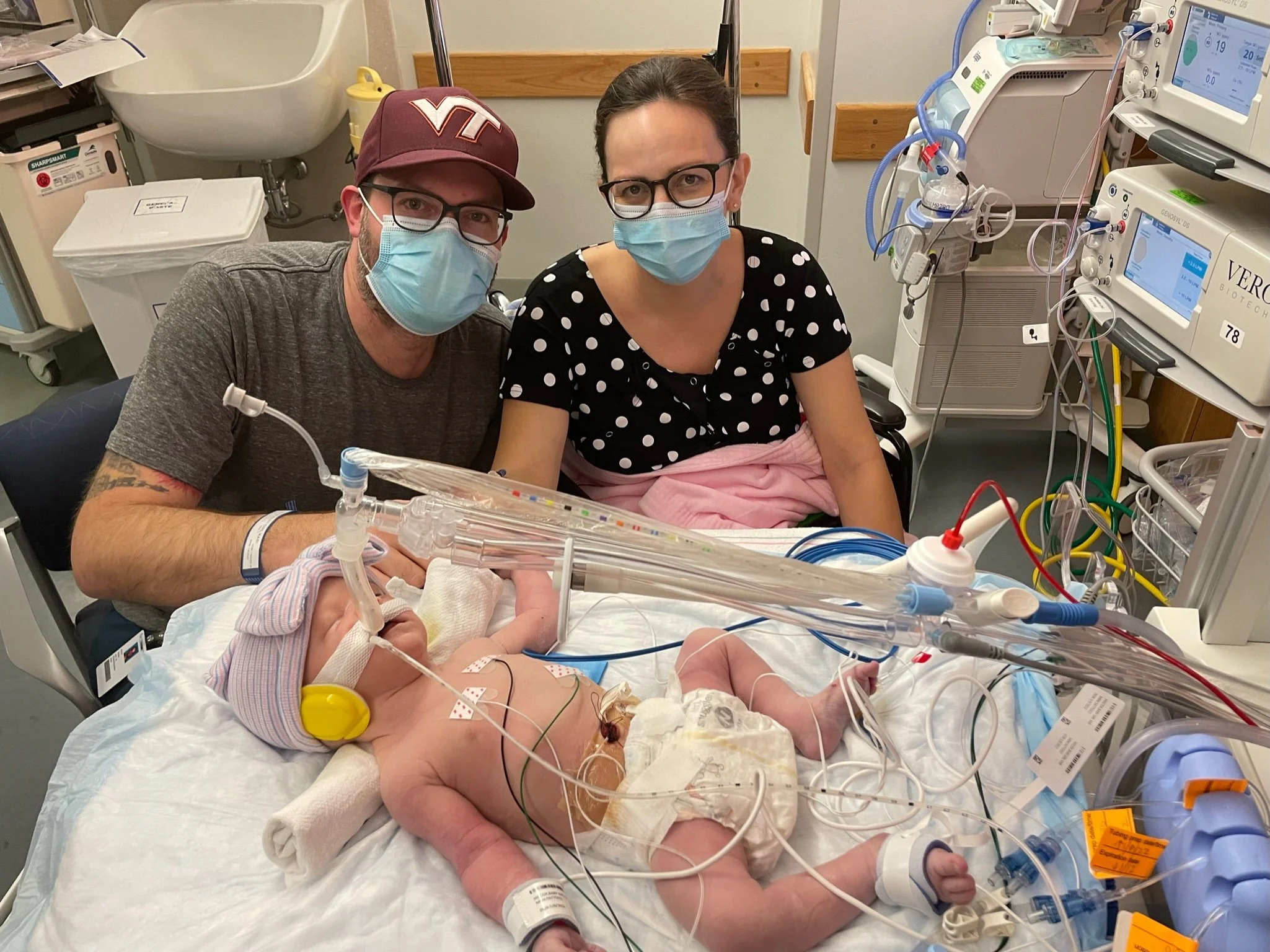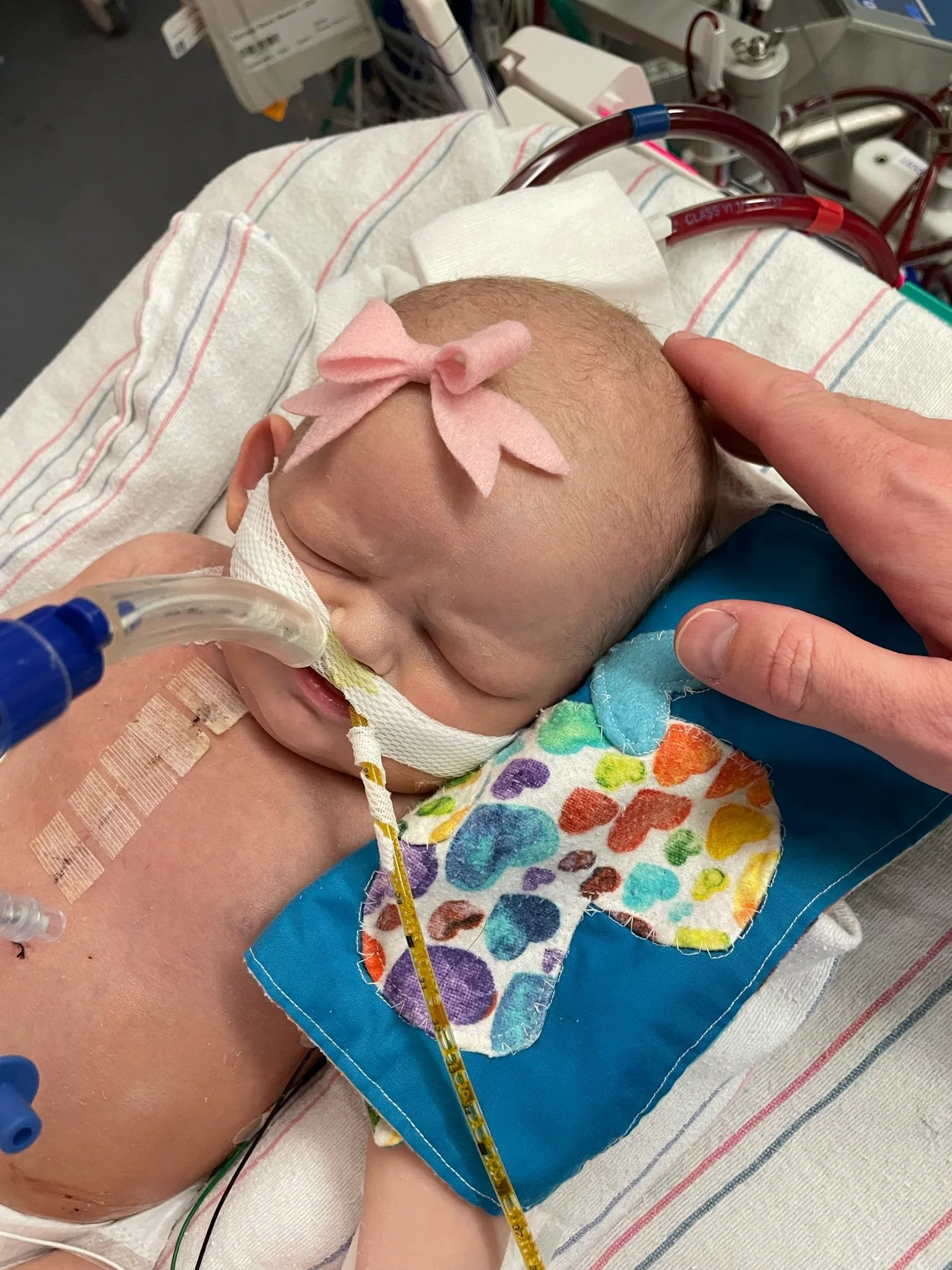 After about 6 hours, we were notified that the baby needed ECMO. This was not going to be a typical CDH course - ECMO is effectively a version of life support and while not unusual for CDH patients, it’s for more severe cases. We knew this could happen and were relieved that the procedure to get her onto ECMO, which is significant, was successful. Unfortunately, not even 2 hours later, the surgeon was back in our room telling us the baby had unusual fluid buildup around her heart and would require exploratory surgery immediately and that she was in critical condition. They suspected she may have a perforated heart or an undiagnosed defect and her life was in danger.