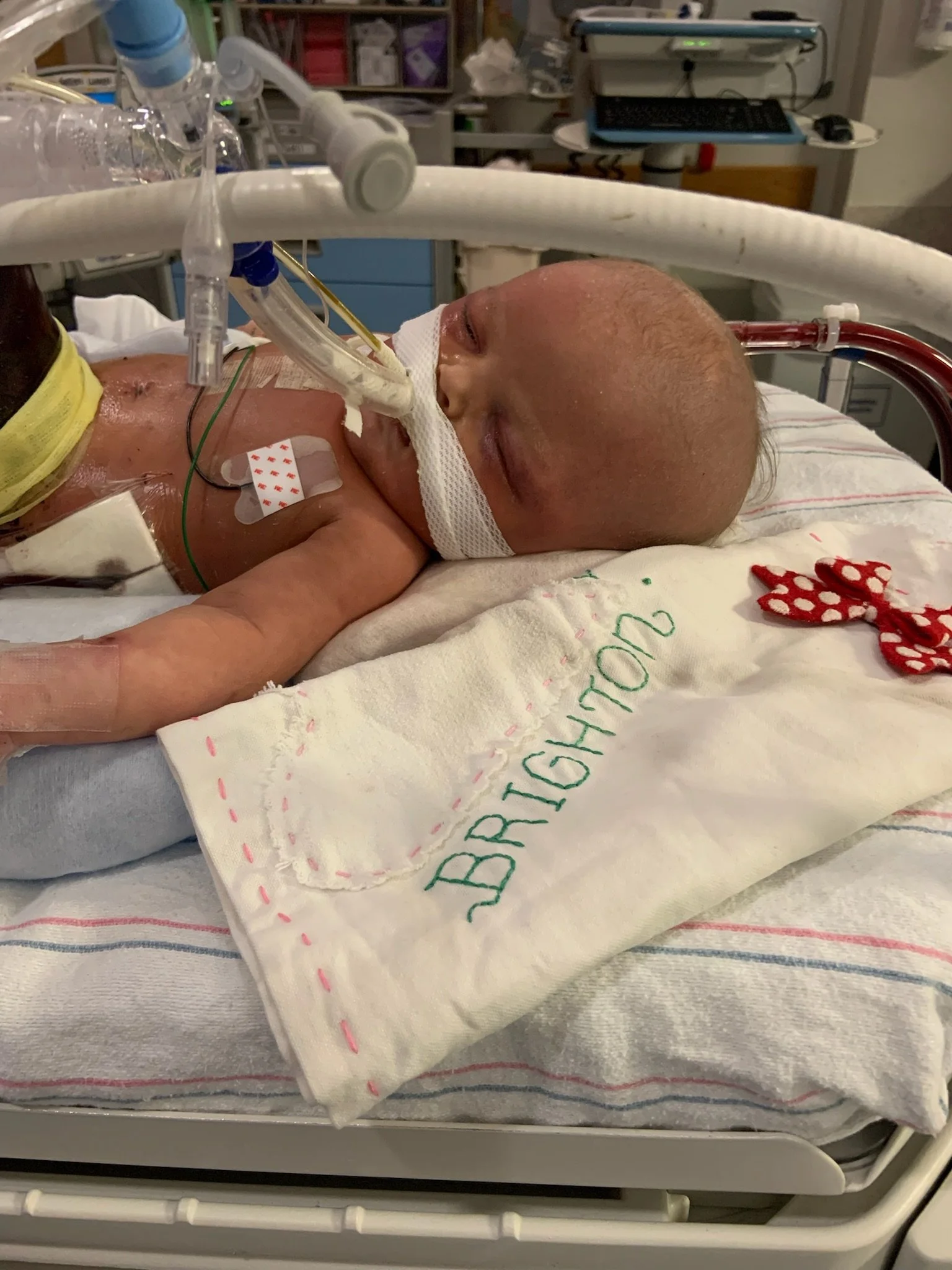 In anticipation of the tough road ahead, Kari’s mom Judy and dear friend Denise Graves flew back in to Philadelphia to provide much needed support. Judy and Denise embroidered scent cloths and kept us company while we were away from the hospital trying to balance our anxiety with love and care.. As Brighton’s surgery approached, it was clear we were hitting a major inflection point. We had a great team and a world-class surgeon working on her, but she was incredibly sick. The picture of “success” was starting to become blurry, and even if she survived surgery and many more months in the hospital, the side effects and toll on her body was painful to see. She was expected to lose fingers and toes and have scars all over her body. They assured us she was not in pain, but as parents we knew the extent of what Brighton was going through and how it would impact her for years to come. At this point until Brighton’s passing about 9 days later, we barely left the hospital.